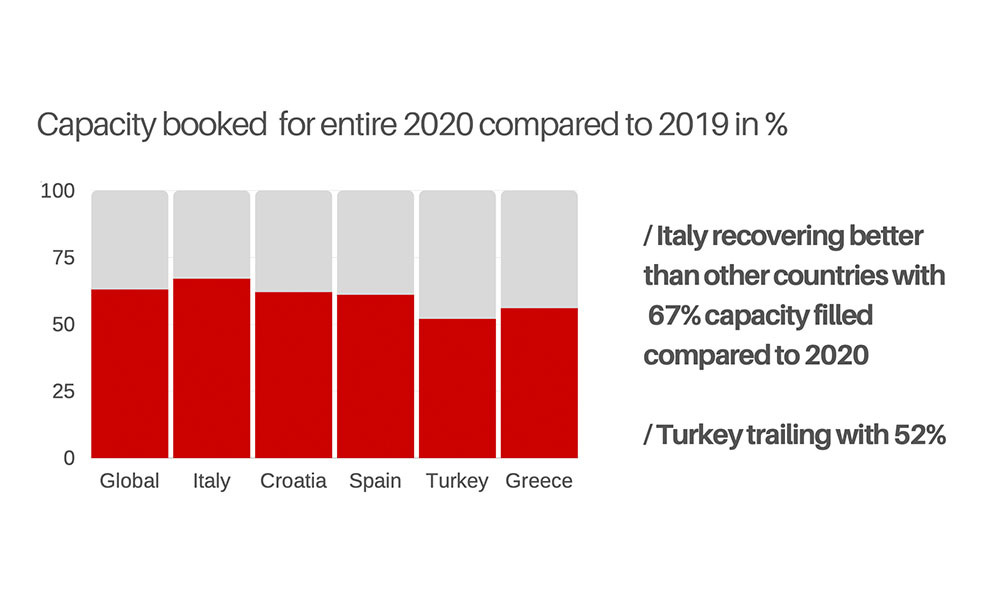 Initial panic in mid-March proved itself healthy because most fleets prepared themselves for the season without any bookings, so being at 45% occupancy of the standard season in first 7 months is actually not so catastrophic since we were all expecting much worse. Booking Manager System is in a unique position to directly be able to monitor global charter activity in real-time, and from this information, we are able to extrapolate with great precision the overall state of the charter market at this moment.